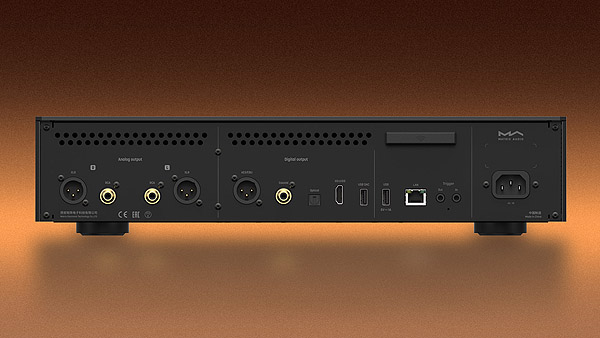 Передняя панель Matrix Audio MS-1cпрактически неотличима от MS-1 2024 года – это корпус классической ширины в 43 сантиметра. Больший интерес представляет задняя панель стримера: сохранены XLR и RCA выходы на высококачественных разъемах. При этом, по сравнению с референсной моделью, MS-1c не предлагает сетевой SFP-вход «LAN по оптике». Также исчезли аналоговые входы, включая разъём фонокорректора, и вход внешнего тактового генератора. Зато присутствует полный набор цифровых выходов на внешние ЦАП, в том числе – i2S. Это позволяет использовать Matrix Audio MS-1c в качестве самого современного Hi-Res транспорта.