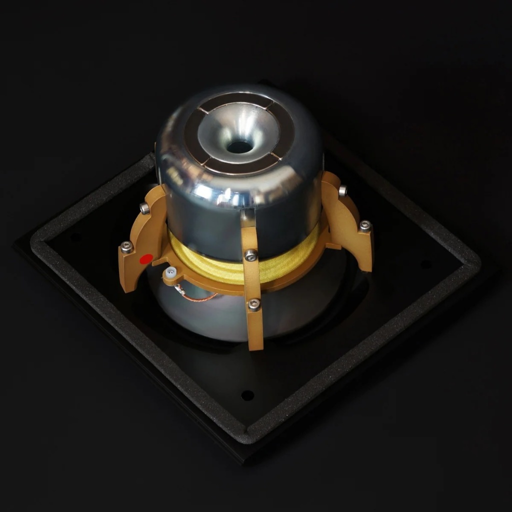 Двигатель состоит из очень сильного магнита (N52 Neodymium) с невидимым ровным магнитным полем в сочетании с нижней подвесной титановой звуковой катушкой. Такое расположение дает приводному блоку самую мощную нижнюю подвесную магнитную систему в мире. Преимущество нижней подвесной звуковой катушки по сравнению с традиционной верхней заключается в том, что она намного более линейна и имеет лучшие динамические возможности. Результатом является идеальный переходный отклик без измеримых искажений.