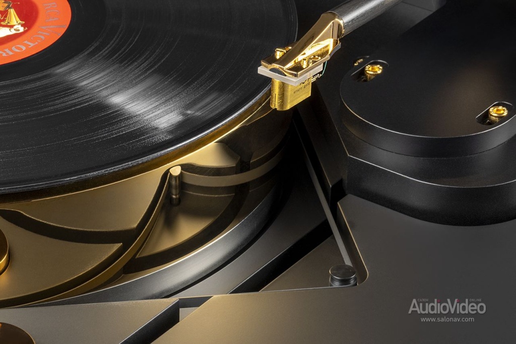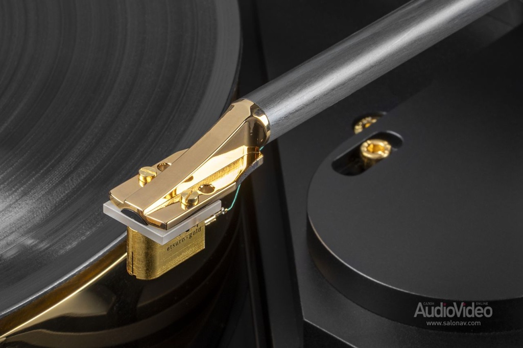 Редкая удача: топовая модель датского гуру, да ещё в эксклюзивном золотом исполнении. Единство формы и содержания: двойное шасси, опорный диск увеличенной массы с вакуумным прижимом пластинки, тангенциальный тонарм с воздушным подшипником и, как завершение композиции — эксклюзивный японский картридж Etsuro Gold ручной работы.