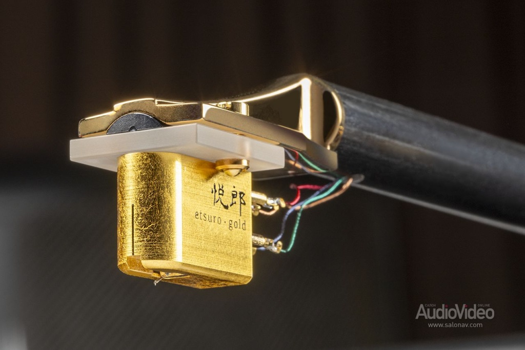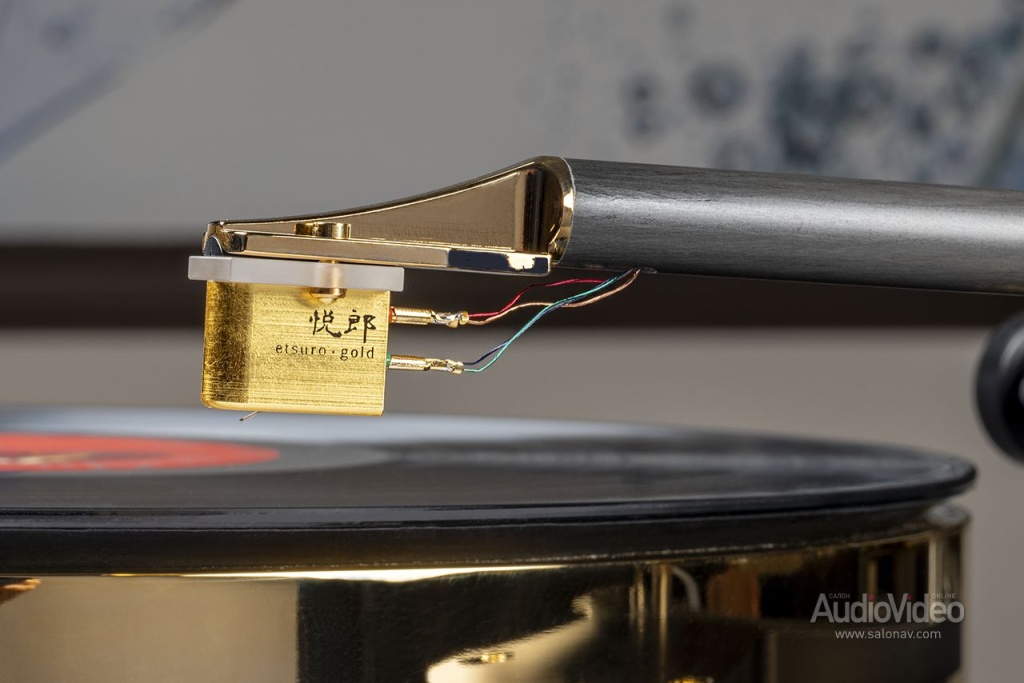 О картридже Etsuro Gold, установленном на проигрывателе, стоит рассказать особо. Это верхняя модель японской компании Etsuro Urushi. Напомню, что Urushi это натуральный лак с особыми свойствами, которым покрываются корпуса головок. Но у флагманской Etsuro Gold он отделан не лаком, а покрыт фольгой из чистого золота 24K. Эту тонкую работу вручную выполняет мастер из специализированной фирмы Hakuichi Co., Ltd в городе Каназава.