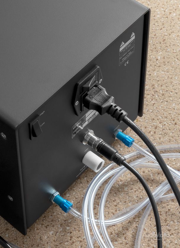 Для подачи воздуха используется внешний компрессор с системой трубок-воздуховодов. Их две, поскольку компрессор выполняет и другие важные функции — создаёт воздушную подушку, снижающую давление тяжёлого диска на опору главной оси, а также разрежение, благодаря которому пластинка прижимается к его плоскости. Напор воздуха для тонарма и диска регулируется отдельно на задней панели проигрывателя.