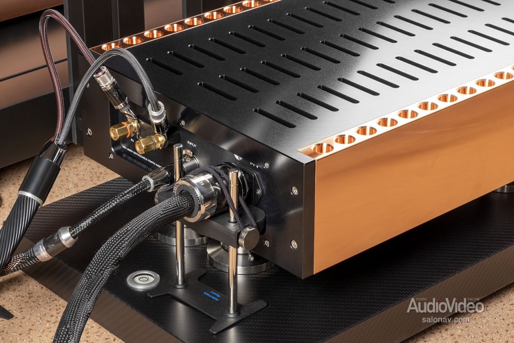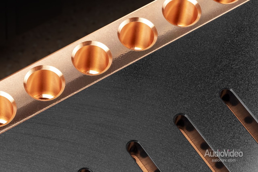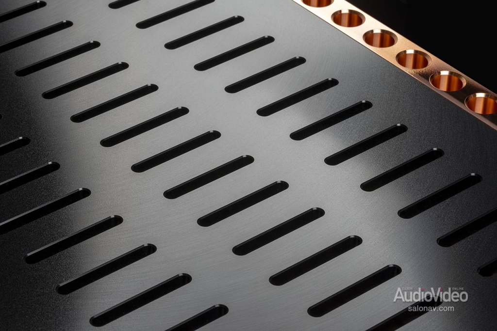 Ещё одно важное обновление — применение в выходном каскаде новых, в 10 раз более мощных и самых быстрых биполярных транзисторов из всех, имеющихся на рынке, которые были разработаны специально для оконечников Relentless. При полосе усиления 69 МГц они позволили не только снизить искажения в верхнем диапазоне, но и уменьшить глубину общей обратной связи. В каждом моноблоке 28 тщательно отобранных транзисторов, по 14 на каждом боковом теплоотводе. Последние традиционно для D’Agostino выточены из меди и имеют профиль Вентури, обеспечивающий максимально эффективный отвод тепла. Для снижения теплового сопротивления каждый транзистор крепится к медной поверхности собственной скобой из нержавеющей стали. Во избежание звона на верхнем краю рабочего диапазона в их базы включены успокаивающие цепочки из резистора и конденсатора. Кроме того, по сравнению с прежними М400 в новой версии существенно расширен диапазон мощностей, в котором выходной каскад работает в классе А.