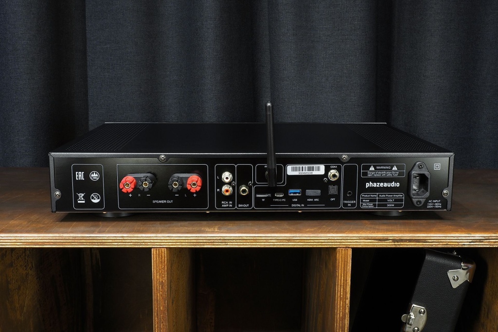 Phaze Audio Volt проходил полевые испытания в системе с напольной акустикой Wharfedale Evo 5.4. Источник сигнала — стример Moon by Simaudio Mind 2, подключенный к усилителю через коаксиальный разъем.