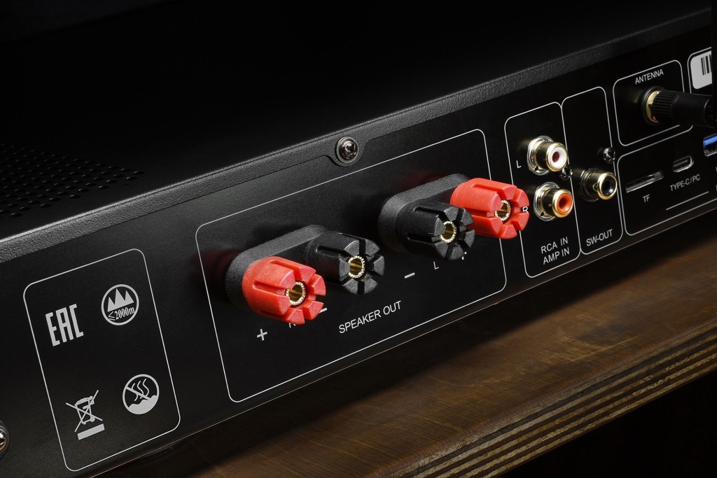 Зато цифровая часть развита не по цене: антенна модуля Bluetooth 5.0, коаксиальный и оптический разъемы, USB для подключения внешних накопителей, USB Type-C 3.1 для подключения к ПК в роли звуковой карты, HDMI ARC для телевизора и даже слот под TF-карты. Колонки подключаются через две пары приличного качества клемм, триггер 3,5 мм пригодится для интеграции в системы управления.