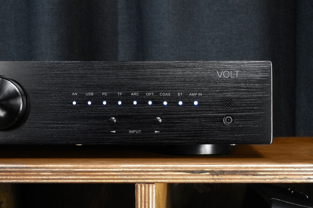 Лицевая панель — лаконично-точеная, с легкими горизонтальными строчками на блике. Специалисты скажут, что ее толщина уже говорит о нормальном качестве звука, и дальше тест можно не продолжать. В центре панели находится ручка управления громкостью, левее — кнопка питания с кольцевой подсветкой, правее — ряд индикаторов активного входа с белыми точками светодиодов. Чуть ниже есть кнопки переключения входов, правее — гнездо для подключения наушников.
