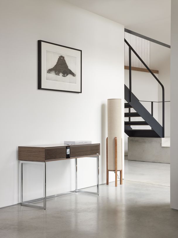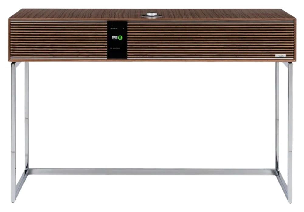 Флагман линейки — R810 High Fidelity Radiogram (типа нашей радиолы) — по сути, это масштабированная вверх версия R410, но предназначенная для более крупных помещений — с увеличенными габаритами (400 х 1000 х 152 мм без подставки), с конфигурацией 2.1, большим числом драйверов (1 х 200 мм, 2 х 100 мм, 2 х 27 мм), раздельным усилением по частотным полосам (5 каналов, класс АВ, суммарно 180 Вт). Но с точно таким же функционалом в том, что касается радиоприема и сетевого стриминга. Единственное принципиальное отличие — наличие штатной металлической подставки, которая позволяет устанавливать систему не на стол или тумбу, а в любом месте комнаты. В качестве опции можно докупить специальный кронштейн для телевизора — получается полноценная AV-система, которой не нужна тумба (экономия, однако). К R810 можно добавить CD-транспорт, сабвуфер, виниловый проигрыватель (другого бренда, поскольку своего пока нет).