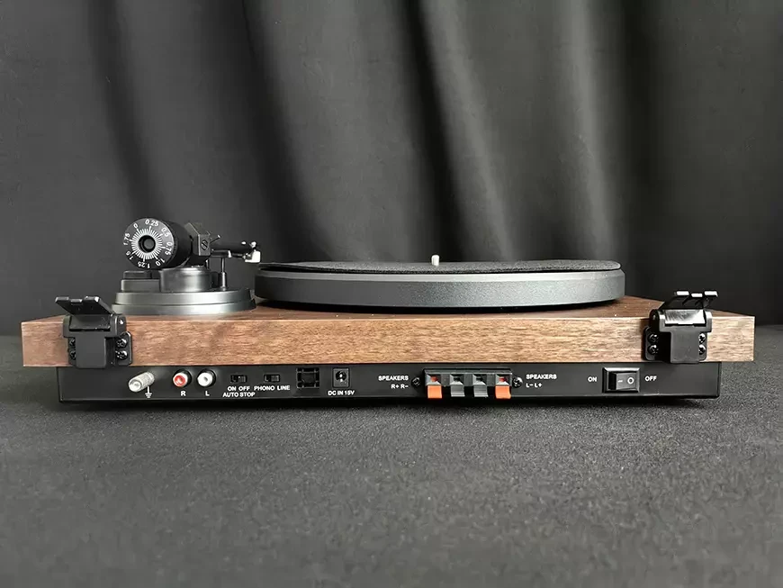 Встроенный фонокорректор здесь отключаемый, так что при желании можно отправить сигнал на внешний модуль без предварительной обработки. Отключается он при помощи тумблера на задней панели. Там же находятся клеммы для акустических проводов, разъем для провода заземления, вход для адаптера питания, а также переключатель режима работы системы автостопа.