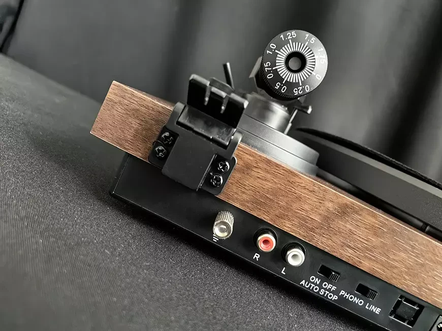 На проигрывателе установлен классический тонарм на карданной опоре, уровень прижимной силы задается при помощи тарированного противовеса. Регулировка высоты основания тонарма не предусмотрена, так что замена картриджа возможна только на аналогичный по высоте. В отличие от многих схожих по конструкции тонармов здесь посадочные места на шелле допускают смещение головки звукоснимателя в продольной плоскости, так что пользователь не так сильно ограничен в геометрических настройках. Штатно на тонарме установлен хорошо всем известный ММ-картридж Audio-Technica AT3600L, он оснащен корончатой иглой со сферической заточкой на углепластиковом кантилевере. Регулировка компенсации скатывающей силы (антискейтинг) выполняется при помощи колесика у основания тонарма.