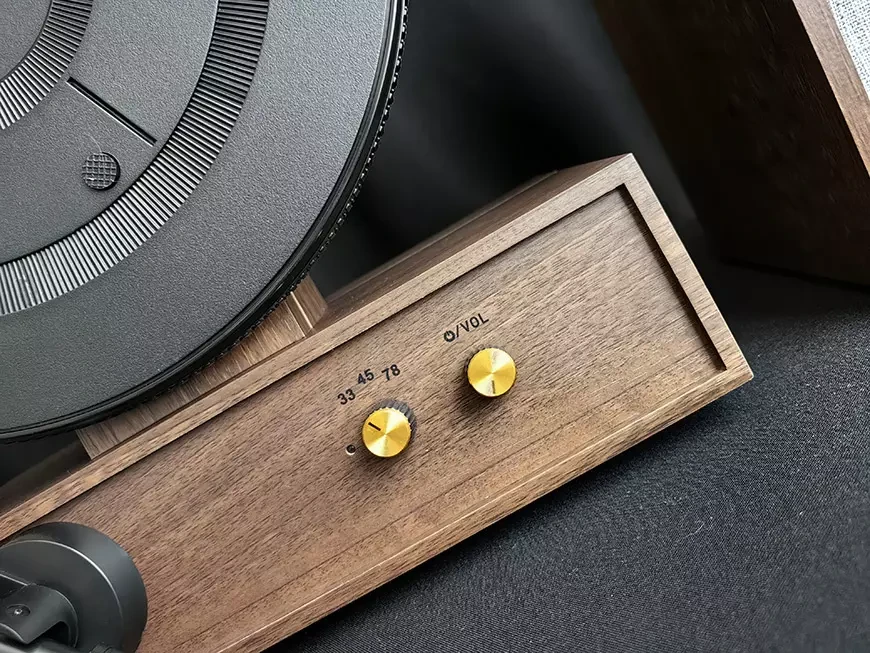Управление переключением скоростей и регулировка громкости осуществляются при помощи двух позолоченных ручек на передней панели центрального блока. Для сопряжения с внешним устройством по Bluetooth нужно воспользоваться соответствующей клавишей на задней стенке проигрывателя.