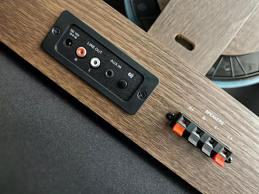 Подключение внешних источников сигнала возможно как по Bluetooth, так и физическим способом к гнезду 3,5 мм. Питание проигрыватель получает от сети через комплектный адаптер.