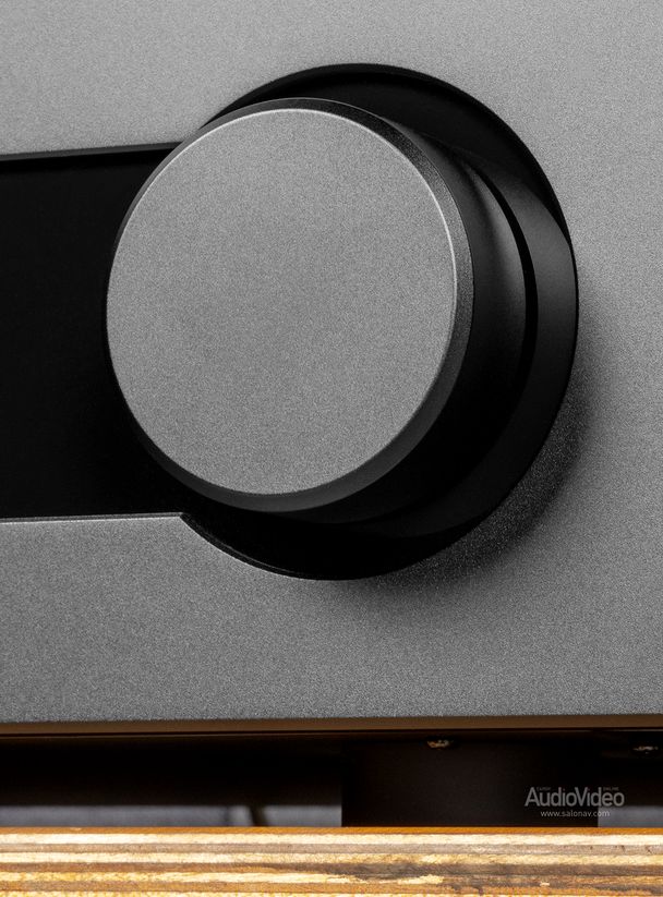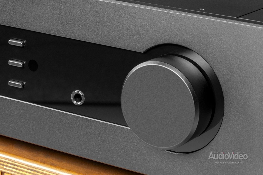 Столь же лаконична и лицевая панель усилителя — регулятор громкости, несколько кнопок и гнездо для наушников.