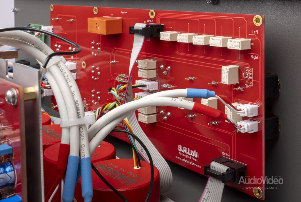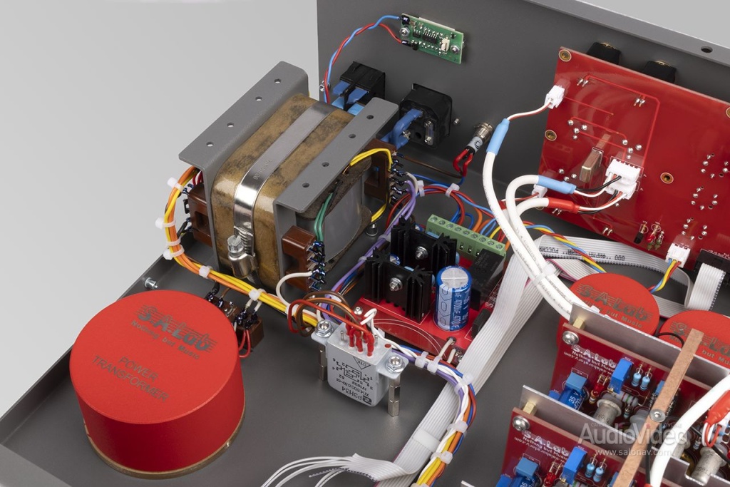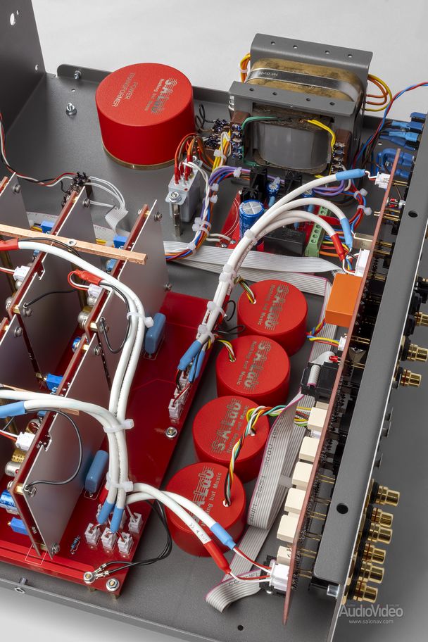 Как видно на фото, внутри преда четыре одинаковых платы, по две на правый и левый канал. Это для того, чтобы обе половинки балансного стереосигнала в процессе усиления могли проходить со входов XLR на выход XLR без промежуточных преобразований в небаланс и обратно. Кроме того, сигнал со входов RCA усиливается совершенно независимо, нигде не пересекаясь с балансным. И превращается в балансный с помощью фирменных входных трансформаторов S.A.Lab. Соответственно, громкость регулируется синхронно по всем четырём линиям.