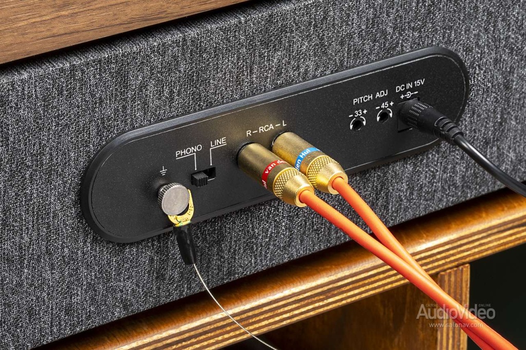 Мощность встроенного усилителя 2 х 12 Вт. В каком классе он работает, производитель не сообщает, но, судя по мощности внешнего адаптера, от которого питается проигрыватель, это всё-таки D. Регулятор громкости находится на верхней плоскости справа от тонарма.