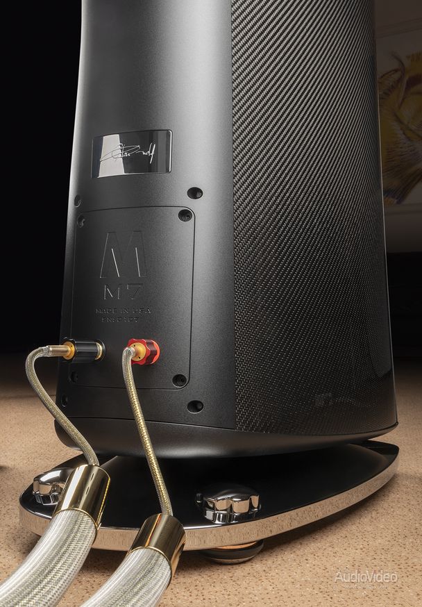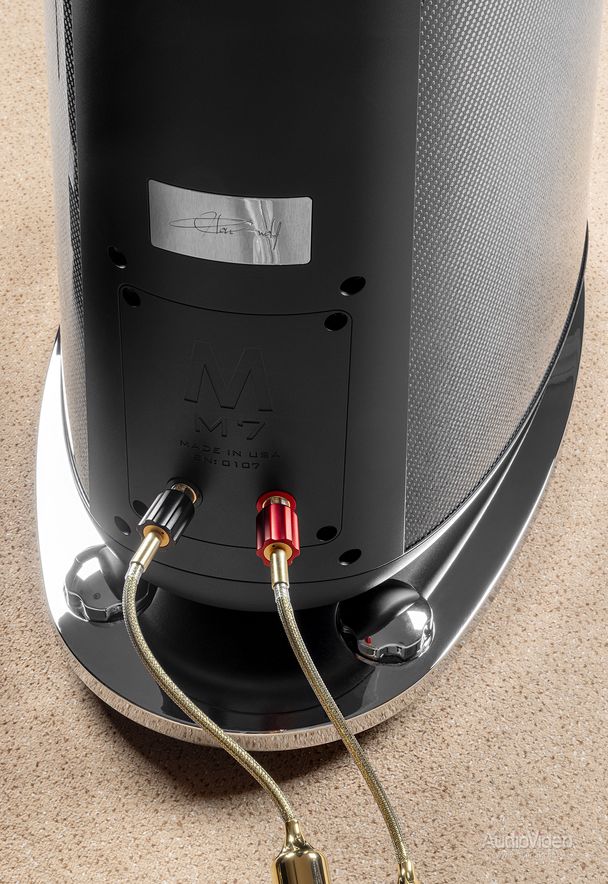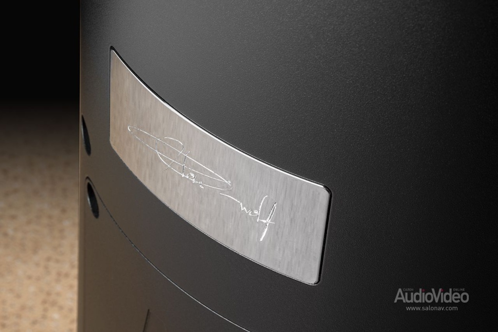 На каждой колонке M7 сзади имеется хромированная пластинка с подписью Алона Вольфа — свидетельство того, что гуру лично одобрил данный экземпляр. И это единственное украшение модели: разнообразных цветов отделки производитель в серии М не предлагает — лишь карбон под лаком и чёрный анодированный алюминий.