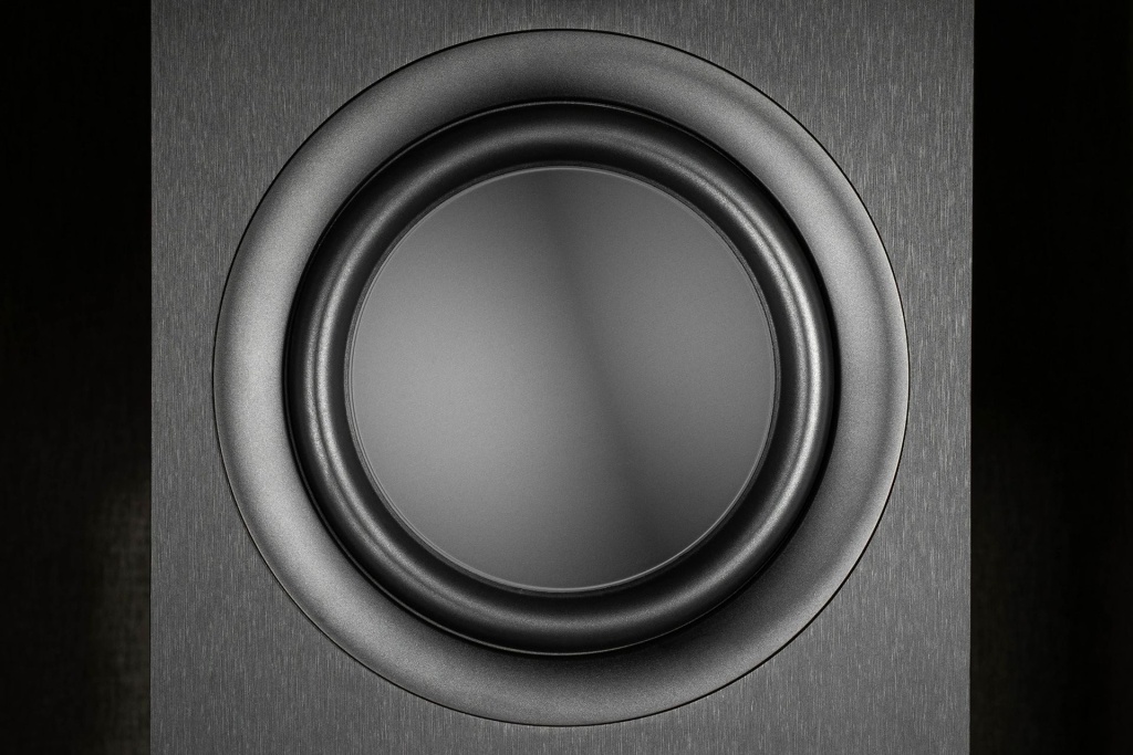 Лицевая панель во многом повторяет стиль старших: в нижней части басовик, выше — фирменное блюдо от британских шеф-инженеров, в котором разместился коаксиальный драйвер. На верхней грани — небольшой выступающий шильдик с названием бренда, чтобы разбавить сложившийся минимализм. Лицевая панель с остальными сторонами кабинета сшита гладко, считай премиально, не выдавая взору ни одного стыковочного шва. А еще под ней ловко спрятаны магниты для крепления комплектных грилей.