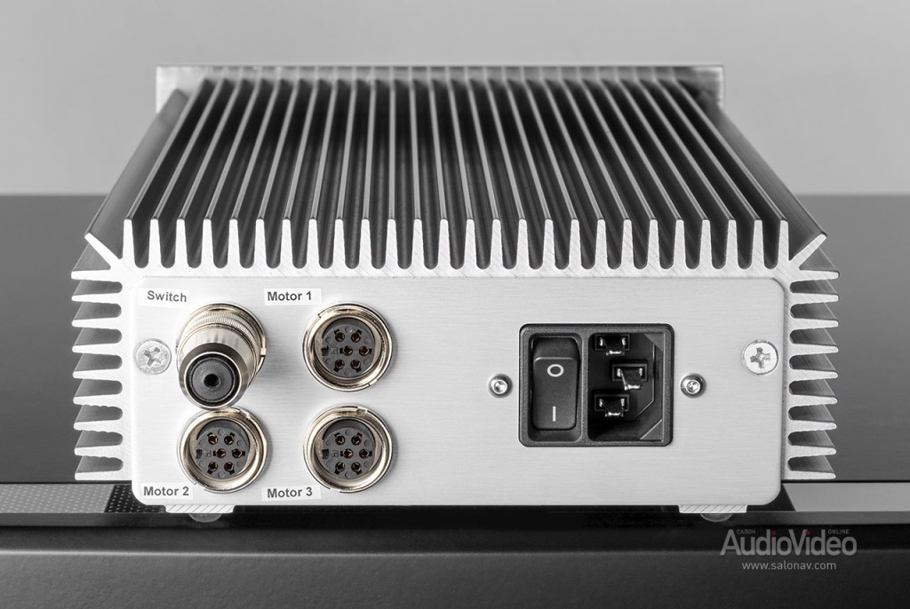 Двигатель питается от выносного блока Konstant FMD, который вырабатывает переменное напряжение с двумя стабильными частотами для 33 1/3 и 45 об/мин. Предусмотрена плавная регулировка обеих скоростей в пределах ±5%. На задней стенке блока имеется заглушка — в этот разъём включается опционная рукоятка Switch для дистанционного включения проигрывателя. Кстати, 10- килограммовый алюминиевый диск стартует плавно, и не только из-за инерции — так сделано специально, чтобы устранить резкие нагрузки на пассик.