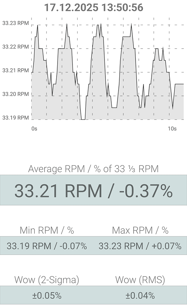 Как видим, привод FMD с массивным диском почти полностью компенсируют мгновенные колебания скорости двигателя — предел её изменений крайне узок — от 33,19 до 33,23 об/мин. Детонация при этом не превышает 0,04%, и это рекордно низкое значение.