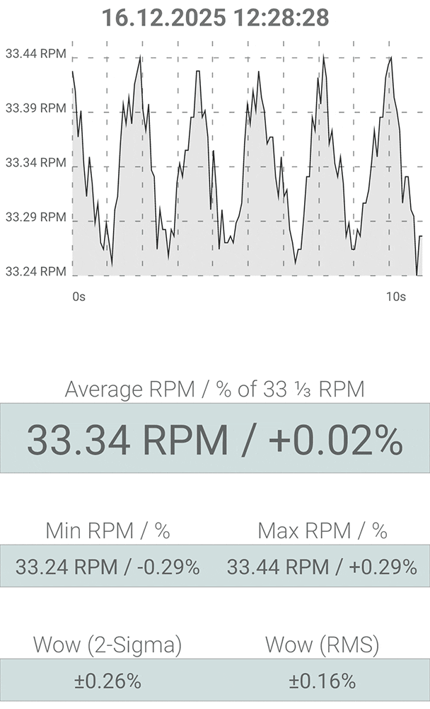 А вот как работает сервопривод: по сигналу с оптического датчика схема питания двигателя постоянно корректирует его скорость в плюс и минус относительного заданного значения. Точность в нашем случае потрясающая, отклонение от 33,33 об/мин всего 0,02%, а среднеквадратичное значение детонации — 0,16%, что значительно меньше заявленного значения (см. таблицу в конце текста).