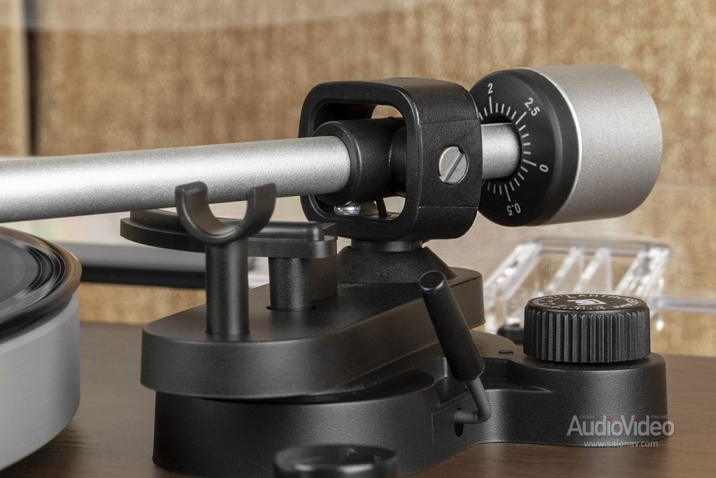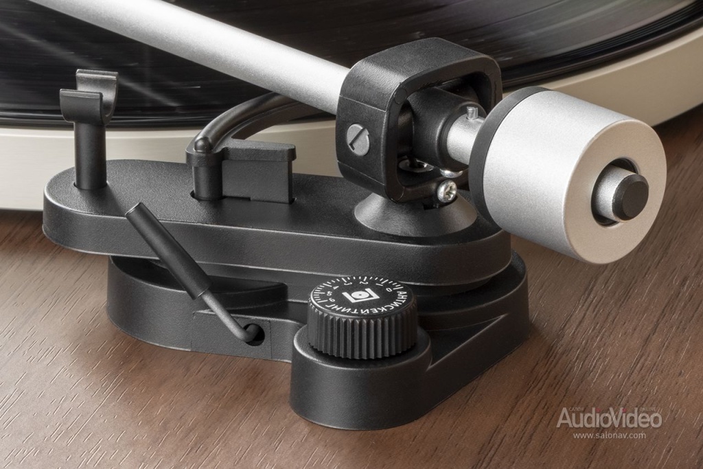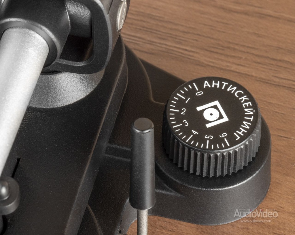 9-дюймовый тонарм имеет классическую двухопорную конструкцию, позволяющую ему плавно и без люфтов перемещаться в двух плоскостях. Антискейтинг регулируется поворотной ручкой с делениями возле опоры тонарма. При повороте тонарма к вводной канавке пластинки включается мотор.
