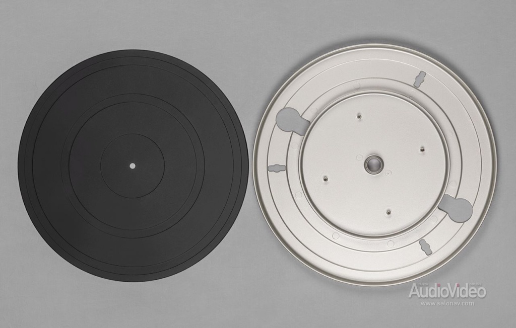 Лёгкий диск, отлитый из алюминиевого сплава, приводится в движение пассиком, надетым не на внешний, как часто делается, а на внутренний обод. При этом, как известно, инерционные свойства маховика используются более полно. Чтобы пассик было удобнее надевать на шкив двигателя, в верхней плоскости сделаны фигурные отверстия. Чтобы не нарушить балансировку, при сборке нужно совместить красные точки на диске и шпинделе, на который он надевается. Штатный мат — резиновый.