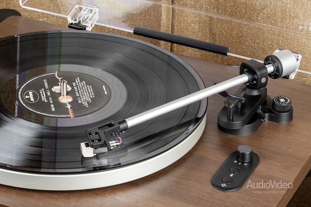 Проигрыватель оснащён встроенным Bluetooth модулем версии 5.3, который даёт возможность слушать музыку с пластинок на мобильных устройствах. Включается он на панели управления, там же находится переключатель скоростей и кнопка MUTE, сбрасывающая громкость при беспроводной трансляции.