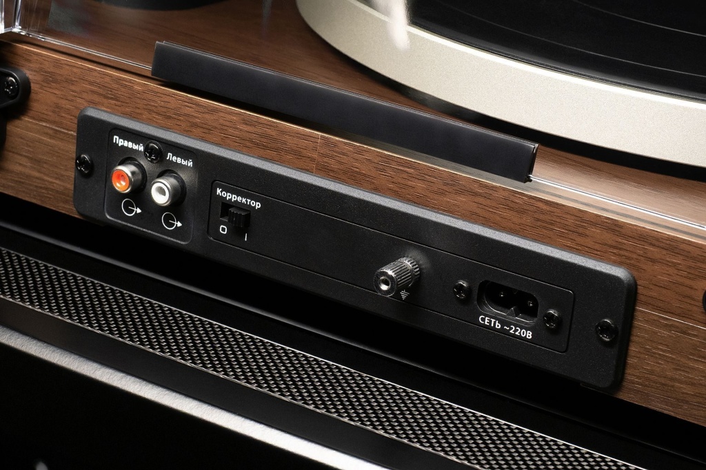 В комплекте есть пылезащитная пластиковая крышка, крепится она стандартно, на подпружиненных кронштейнах к задней панели. Здесь же находится коммутация: пара RCA для вывода аналогового сигнала, клемма «земли» и «восьмерка» питания. Единственный тумблер позволяет отключать встроенный фонокорректор — полезно, если праздный быт подтолкнет к экспериментам и желанию услышать свой же проигрыватель в новом амплуа.