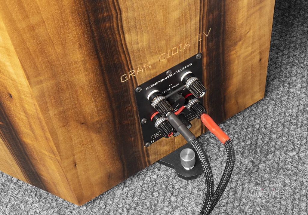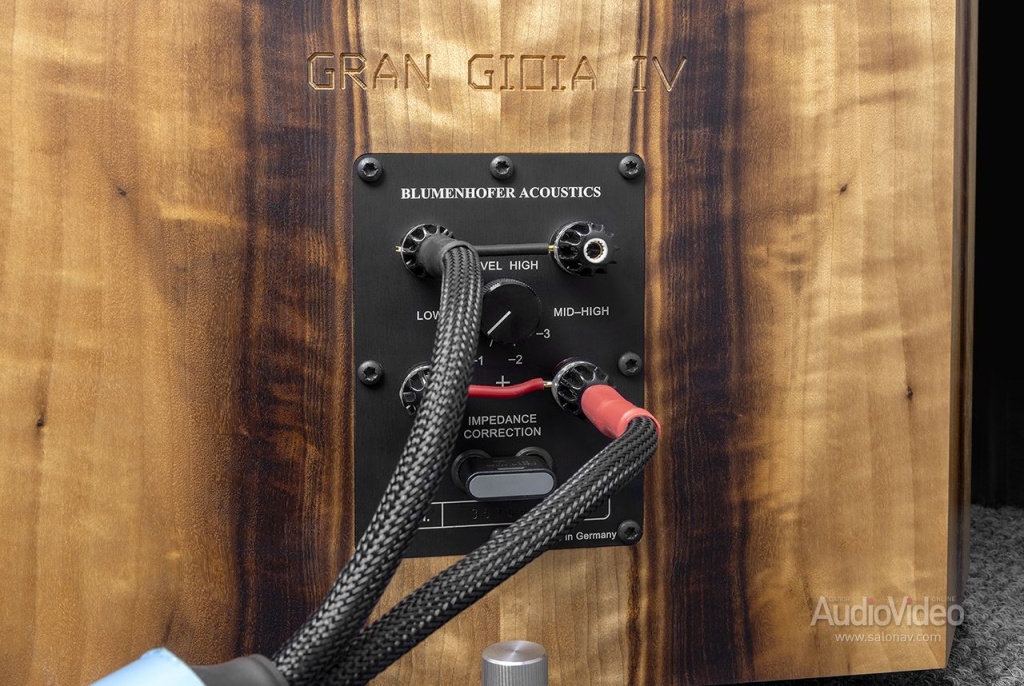 У компрессионного ВЧ-драйвера с 75-миллиметровой (3”) титановой мембраной собственный экспоненциальный рупор, который усиливает отдачу в верхней полосе и оптимизирует диаграмму направленности в горизонтальной плоскости. Общая чувствительность Blumenhofer Gran Gioia IV — 100 дБ/1Вт/1м, т.е. теоретически эти гиганты могут работать и с трёхваттным усилителем.