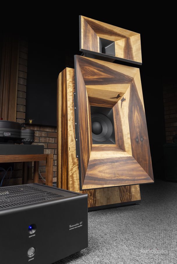 Напомню, что в прошлом веке аудиоиндустрия началась именно с рупорной акустики, которую стали разрабатывать для первых звуковых кинотеатров. Такая конструкция объяснялась просто: маломощным ламповым усилителям того времени требовались звуковоспроизводящие агрегаты с высокой чувствительностью, а в этом отношении, как известно, рупорам равных нет. Тем не менее, их массовый переход в сферу домашнего аудио так и не состоялся из-за неудобных габаритов таких систем и, в немалой степени — из-за специфической рупорной окраски звучания. Но Томас Блюменхофер, посвятив этой теме более 20 лет и сумев избавиться от врождённых недостатков рупоров, создаёт настоящие акустические шедевры.