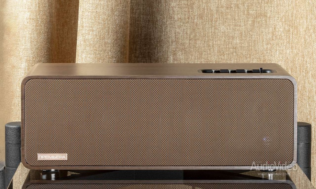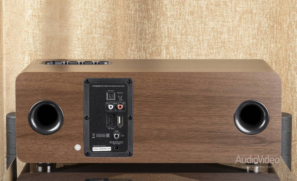 В отличие от классических телевизионных саундбаров, модель Premiera ES-422A имеет гораздо более скромные габариты и совершенно иные пропорции — ширина корпуса у неё стандартная для Hi-Fi — 430 мм, высота 165 мм и глубина 182 мм. На передней панели под несъёмным грилем установлены четыре динамика, по паре для каждого канала — 100 мм басовик с диффузором из крафт-бумаги и твитер с дюймовым тканевым куполом. НЧ-драйверы работают при поддержке фазоинверторов с портами на задней стенке корпуса, и в таком оформлении, согласно данным производителя, воспроизводят бас от 50 Гц. Поскольку твитеры озвучивают полосу с верхней границей 20 кГц, получается полноценная стереосистема с хай-файным частотным диапазоном. Встроенное усиление соответствующее — класса D с выходной мощностью 2 х 20 Вт в номинале и 2 х 35 Вт в пике. Для вспомогательной системы — в спальне, на кухне или рабочем столе — более чем достаточно.