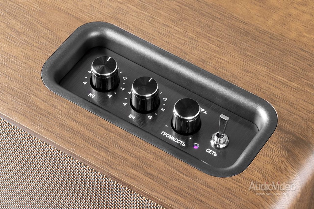 В нише на верхней плоскости корпуса спрятаны три регулятора — громкости и тембра с коррекцией на 100 Гц/10 кГц и глубиной ±6 дБ. Там же находится тумблер без фиксации, отвечающий за выбор нужного источника. Их пять, включая Bluetooth 5.3, и активация каждого подтверждается индивидуальным цветом светодиода.