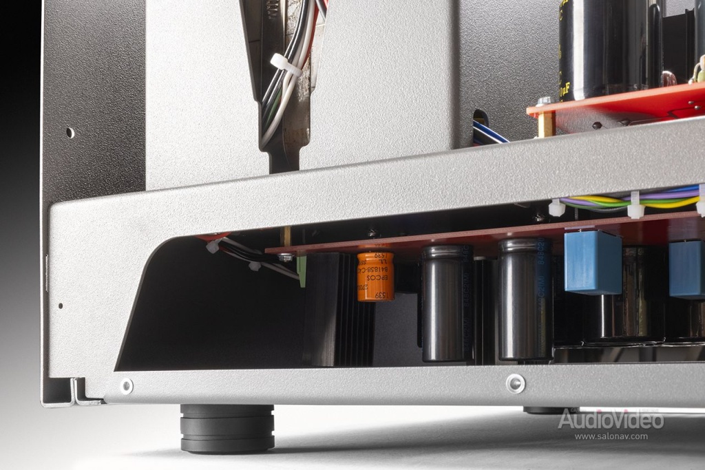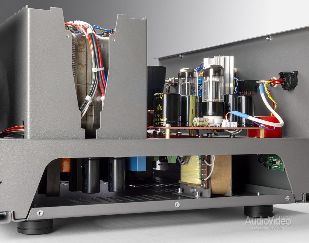 На нижнем этаже установлен менее мощный трансформатор для питания цифровой схемы контроля и схемы реле для переключения входа RCA — XLR. Там же — стабилизаторы накала, анодного напряжения драйвера и питания экранных сеток выходных ламп. Они построены с применением дросселей и мощных высоковольтных MOSFETов.