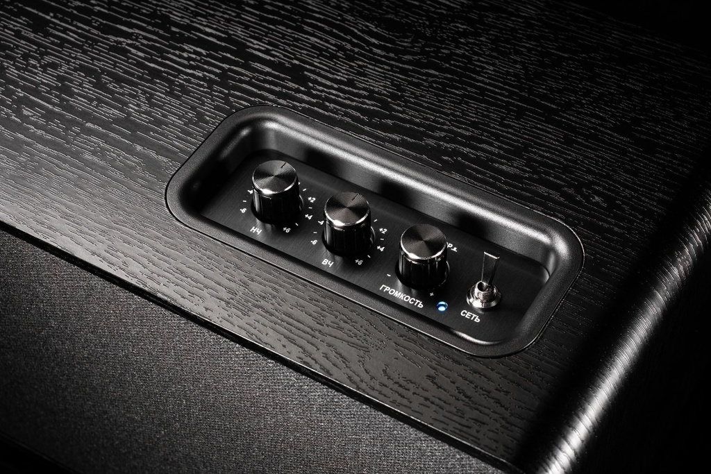 На верхней грани располагается стационарный пульт управления. Он утоплен в корпус — так достигается более эстетичный вид и ручки регулировок смотрятся более грациозно. Две из них отвечают за управление количеством верхних и нижних частот, еще одна работает как многофункциональная: при вращении управляет громкостью, при нажатии меняет активный вход.