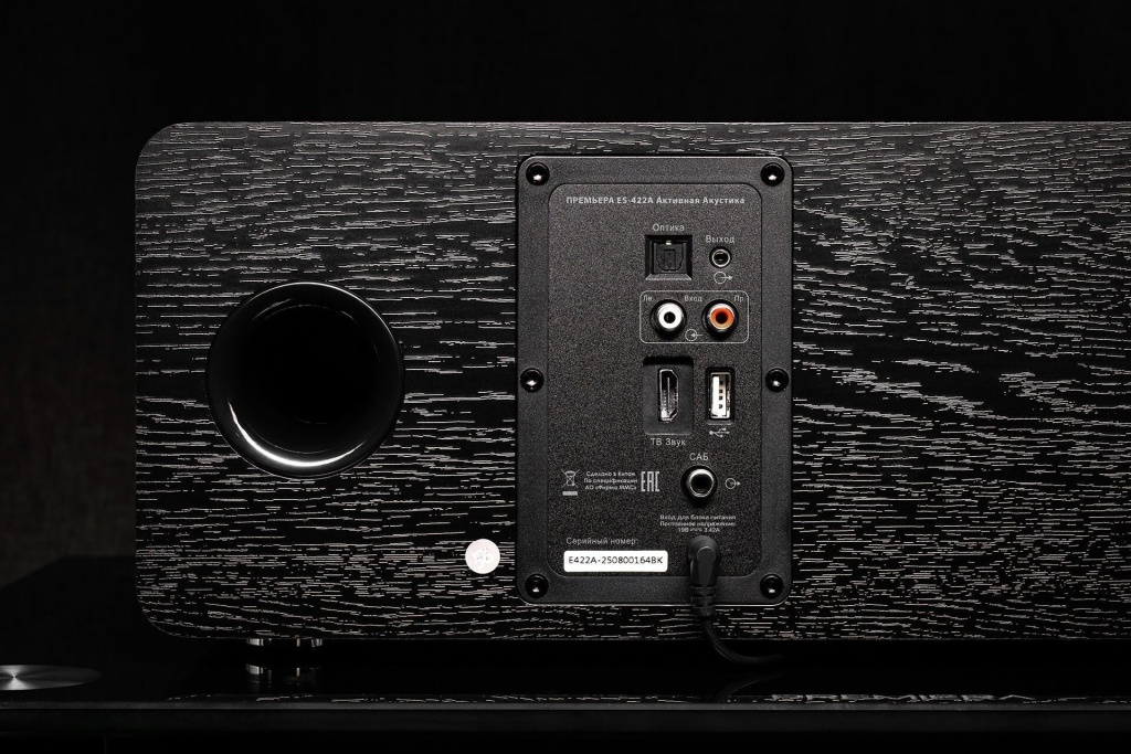 По сторонам задней панели разнесены фазоинверторы, между ними находится блок коммутации. Способов получить сигнал от внешних источников достаточно: для аналогового сигнала есть пара RCA, для цифровой коммутации предусмотрены оптический вход, HDMI ARC и USB Type-A — в него можно подключить флешку с музыкой. Предусмотрен выход на сабвуфер и даже выход на наушники 3,5 мм, который открывает возможность для чисто лайфстайловых сценариев: подключаем смартфон по Bluetooth к ES-422A, а к ней — аналоговые проводные наушники. Шах и мат, индустрия TWS.