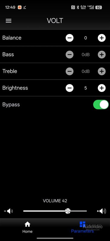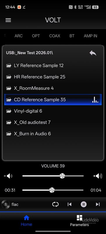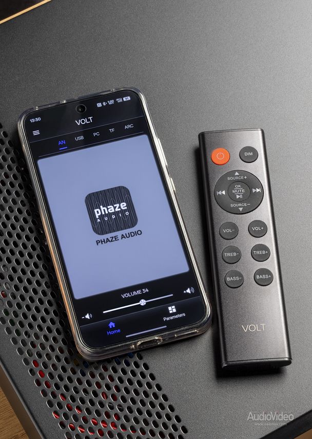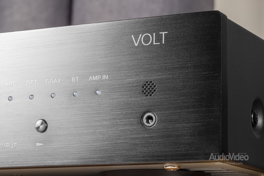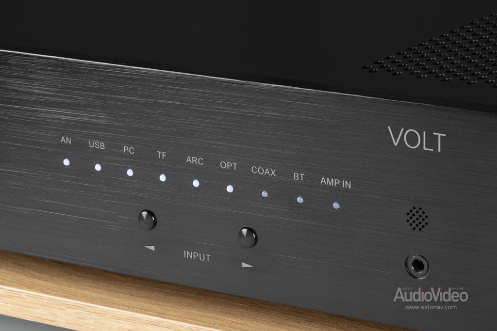 Сделан он по-современному — с упором на цифровые источники. К «Вольту» можно направить сигнал по коаксиальному или оптическому кабелю, по USB Type-C или HDMI ARC. Также имеется гнездо под USB-флешки и под карту памяти для прямого воспроизведения файлов в форматах WAV, FLAC и APE. Имеется, наконец, и модуль Bluetooth версии 5.0 для передачи аудио со смартфона. На последний стоит поставить управляющее приложение (работает по «блютузу» — никаких сеток не надо) и таким образом получить полный контроль над функциями усилителя и встроенным в него цифровым плеером. Реализовано все изящно, работает отлично, но для большего удобства в комплектацию Volt входит и традиционный пульт ДУ.