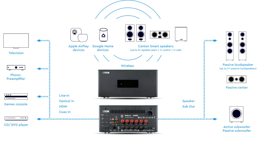 Несколько лет развитие платформы шло ускоренными темпами, и сейчас в каталоге Canton можно найти десятки устройств с поддержкой SMART, начиная от саундбаров и заканчивая элитными напольными громкоговорителями Reference. И хотя пользователь для начала может просто приобрести пару колонок SMART, используя их как активные или цифровые громкоговорители, максимальный потенциал платформы лучше всего раскрывают AV-усилитель Canton Smart Amp 5.1 и AV-предусилитель Canton Smart Connect 5.1. Оба устройства имеют функции потокового воспроизведения и мультирума, позволяют комбинировать в одной зоне беспроводные колонки Canton SMART с обычными громкоговорителями (до 6 проводных и 8 беспроводных каналов), Устройству Smart Connect понадобится промежуточный усилитель, зато с его помощью к платформе можно подключить обычную аудиосистему. Встроенный звуковой процессор устройств работает с форматами Dolby Atmos и DTS-HD, поддерживая конфигурации каналов вплоть до 7.1.4. Усилитель Smart Amp удобно использовать в инсталляционных проектах, его суммарных 600 Вт с запасом хватит для 6 встраиваемых колонок. На устройства можно подавать и видео: они оснащены тремя входами и выходом HDMI с функцией eArc.