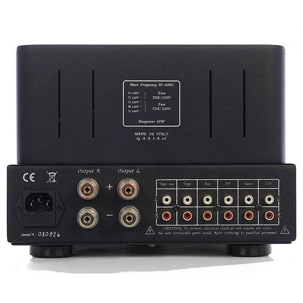 Качество изготовления усилителя очень высокое, здесь не заметно никаких компромиссов, которые можно было бы ожидать, учитывая относительно невысокую стоимость Simply Italy. Деревянная лакированная передняя панель с контрастными вставками вокруг точеных ручек управления, выполненных из немагнитного материала и тумблера включения, имеющих приятный рабочих ход, позолоченные контактные поверхности всех разъемов, точно пригнанные детали – придраться во внешнем облике аппарата буквально не к чему. Две изогнутых, отполированных до зеркального блеска панели служат в качестве тепловых отражателей для ламп, которые довольно сильно греются при работе усилителя. При желании лампы можно закрыть защитной металлической сеткой, которая приобретается отдельно.
