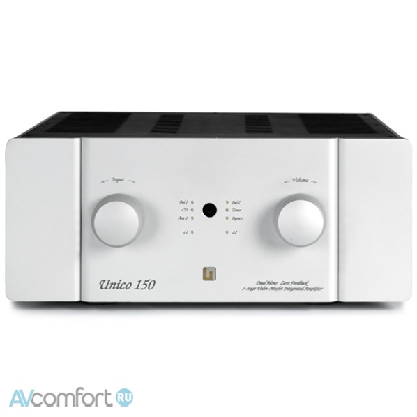 Информация взята с сайта avcomfort.ru Расширяя модельный ряд, Unico 150 построен на двухкаскадном ламповом предусилителе на триодах ECC83 и 6H30, работающих в классе А, и выходные каскады на заказных комплементарных полевых транзисторах (4 пары на канал), включенных в режиме А/В.