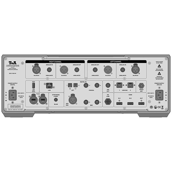 Показателем серьёзности подхода T+A к делу является блок питания. В то время как почти все остальные компании используют общие блоки питания для аналоговых и цифровых трактов (даже если они разделены на отдельные линии питания, они используют один и тот же вход питания), SDV 3100 HV идёт ещё дальше, используя отдельные линии IEC для аналоговых и цифровых сигналов. В любом случае, это конструкция двойного моно, но два кабеля питания не относятся к левому и правому каналам; если вы хотите по-настоящему поэкспериментировать, вы можете выбрать идеальный кабель питания для цифровых и аналоговых схем.