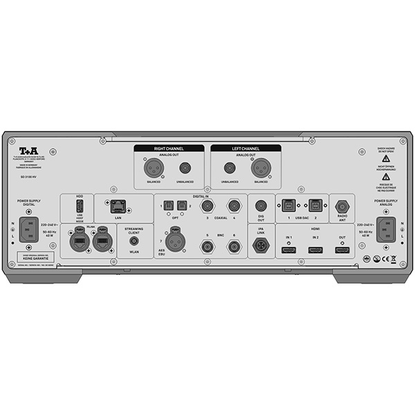 Модель обладает полным набором цифровых входов, в т. ч. BNC, балансным AES/EBU и фирменной шиной IPA Link, которая служит для высокоточного приема PCM- и DSD-потока от CD/SACD-транспорта PDT 3100 HV. Присутствует пара HDMI-входов для передачи PCM-стереосигнала и HDMI-выход с поддержкой возвратного канала ARC. Имеются выходы RCA и XLR, разъемы системной шины H-Link, порт LAN, два порта USB DAC и два USB для внешних накопителей. Для управления проигрывателем можно использовать пульт или фирменное мобильное приложение T+A Music Naviagtor...