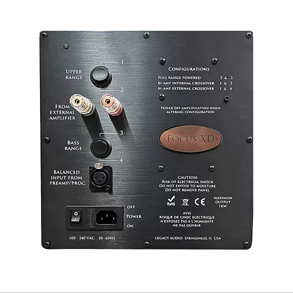 Отлично демпфированный и зауженный в верхней части корпус Legacy Focus XD не имеет параллельных поверхностей во избежание появления внутренних стоячих волн. На тыльной стороне расположена пара винтовых клемм, балансный вход и два тумблера для выбора конфигурации, соответствующей определенному способу подсоединения АС. Внутри находятся платы пассивного кроссовера. Доступны три варианта подключения Legacy Focus XD, каждый из которых имеет свои особенности.