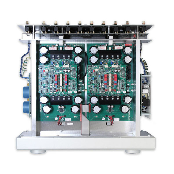 На задней панели расположена симметричная структура двойного моно P 3100 HV. Каналы последовательно разделены. Платы предусилителя расположены под крышкой корпуса и имеют симметричную конструкцию. Это исключает электромагнитные помехи. Платы размещены в отдельном отсеке, выполненном из толстостенных (10–15 мм) алюминиевых пластин, и полностью изолированы и экранированы от источника питания, а также от источника питания в нижней части корпуса.