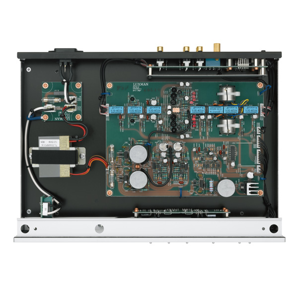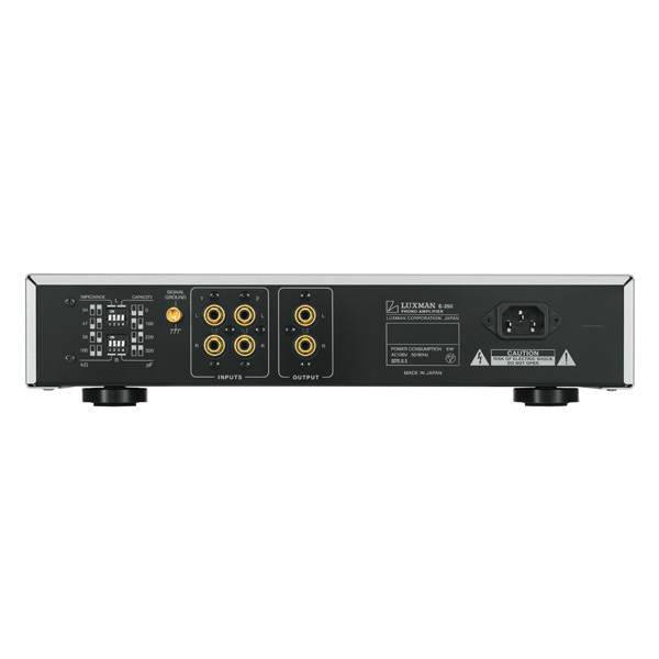 В Luxman E-250 применяется схема RIAA-коррекции NF-типа, которая использует отрицательную обратную связь и обеспечивает высокий показатель соотношения сигнал/шум. Работу по усилению сигнала MC-картриджей выполняют повышающие трансформаторы, оснащенные сердечниками из сплава супер-пермаллой. При этом переключатель на фронтальной панели позволяет выбрать один из двух вариантов коэффициента усиления и входного сопротивления для MC-головок: 57 дБ/40 Ом или 66 дБ/2,5 Ом.