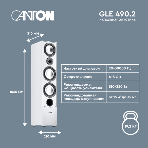 Информация взята с сайта avcomfort.ru Акустическая напольная система GLE 490.2 популярной серии от немецкого производителя компании Canton - это превосходный дизайн и звучание высокого класса, благодаря частотному фильтру, гармонично согласованному с выходящим на заднюю панель резонансным отверстием для басов. Мощные низкочастотные динамики и подвижные среднечастотные системы с алюминиевыми мембранами обеспечивают максимальный диапазон частот, высокое звуковое давление и сбалансированное, характерное для серии звучание. За основу были взяты динамики из старших моделей (Vento, Ergo, Karat). Точнейшие мягкие купола «Soft Dome» с алюминиевой звуковой катушкой встроены в трансмиссионную переднюю панель.