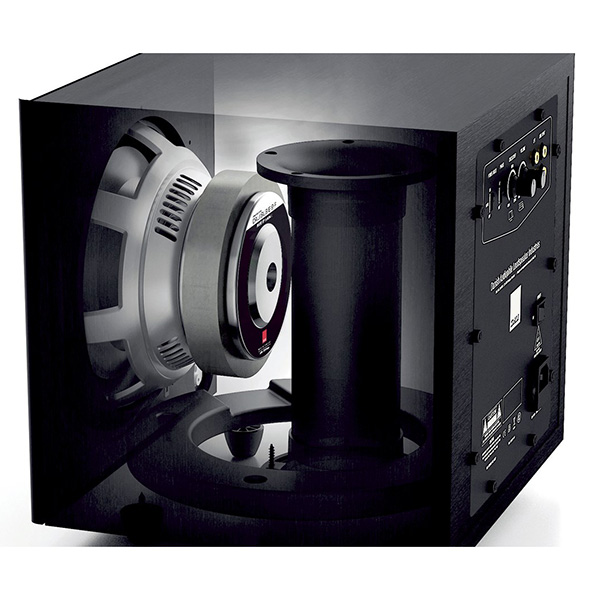 Встроенный усилитель класса D мощностью 170 Вт ( RMS ) преобразует поступающий сигнал с абсолютным минимумом искажений. Пиковая мощность сабвуфера достигает 220 Вт. Импульсный источник электропитания является одной из причин очень низкого энергопотребления усилителя – всего лишь 0,4 Вт в режиме ожидания. При этом усилитель обладает впечатляющей эффективностью в 70%. Благодаря высокопроизводительному тракту усиления и продуманной конструкции источника питания в совокупности они производят минимальное количество тепловых потерь. Поэтому теплорадиатор этому сабвуферу не требуется.