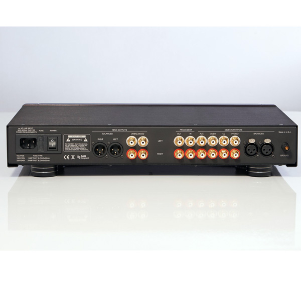 Входы предусилителя: четыре RCA (один из которых – вход фонокорректора), балансный XLR. Есть петля «вход/выход» для подсоединения эквалайзера или процессора. Выходы: два линейных RCA, балансный XLR. На тыльной стороне корпуса имеется тумблер включения питания и заземляющая клемма.