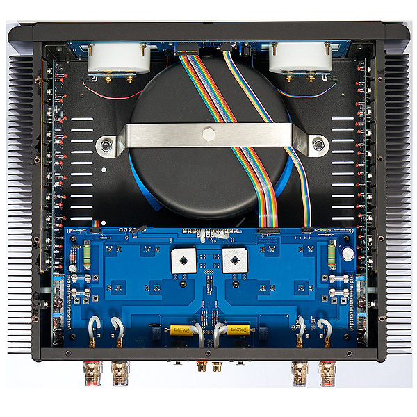 Информация взята с сайта avcomfort.ru В усилители используются высококачественные тороидальные трансформаторы 3000 ВА с независимыми выпрямителями и общей емкостью около 80 000 мкФ с очень низкими значениями ESR и индуктивности. Токовый каскад способен производить токи, превышающие в пике 100 ампер, с такой степенью линейности и скорости, на которую не способны другие усилители, производящие лишь часть этого тока. При такой линейности и пропускной способности не используется общая коррекция обратной связи...
