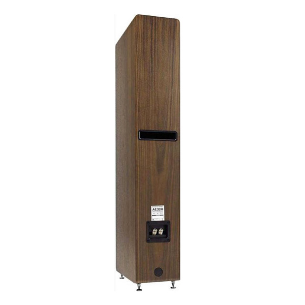 Колонка опирается на четыре металлических шипа по углам основания, и кажется очень устойчивой после регулировки по уровню. AE320 имеет высоту в метр, а весит каждая 26 кг. Это увесистая колонка, и все же, благодаря своей узкой передней части, она выглядит элегантно, если смотреть с места прослушивания.