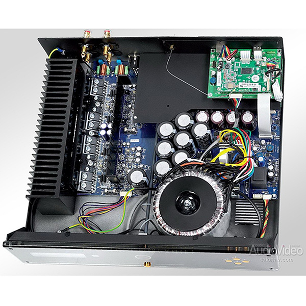 В усилителе применяется полностью балансная топология схем. Входной дискретный каскад соответствует классу A (обратная связь в нем не используется). На выходе стоят мощные транзисторы и уже задействована обратная связь. Блок питания усилителя оснащен тороидальным трансформатором в 500 ВА и конденсаторами суммарной емкостью в 80000 мкФ, что позволяет ему развивать 125 Вт на канал при 8 Ом.