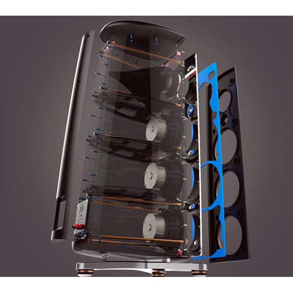 Четыре массивные алюминиевые заготовки, используемые для изготовления наружных поверхностей, специальным образом обработаны для получения изогнутых поверхностей без углов. Толстая внутренняя алюминиевая перегородка надёжно удерживает драйверы, в то время как 10 специальных стержней стягивают переднюю и заднюю панели, дополнительно повышая жёсткость конструкции.