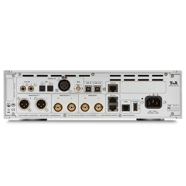 ЦАП T+A 200 оснащен широким набором цифровых входов, которые позволяют обрабатывать множество типов аудиофайлов с разрешением до 24 бит / 192 кГц на большинстве входов. USB-входы поддерживают формат до 768 кГц и файлы DSD до DSD1024. Также имеется один небалансный аналоговый вход.